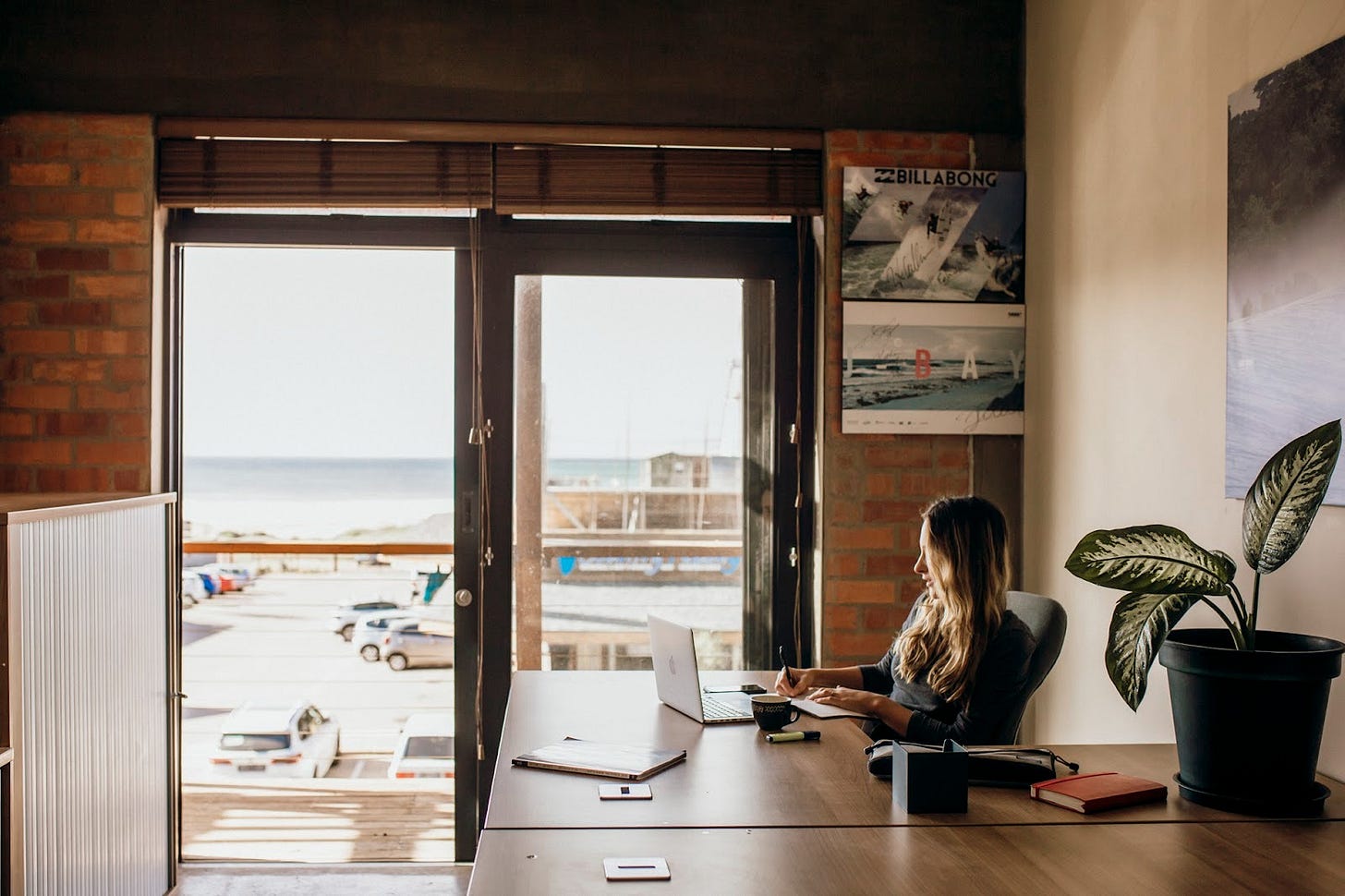 An “ocean-minded” space was made easier in practice because we inherited the office from Billabong. It’s right next to the beach with these floor-to-ceiling doors and windows overlooking the ocean; it’s impossible to ignore! It’s not unusual to be distracted during an online meeting by a breaching whale or a perfect wave.